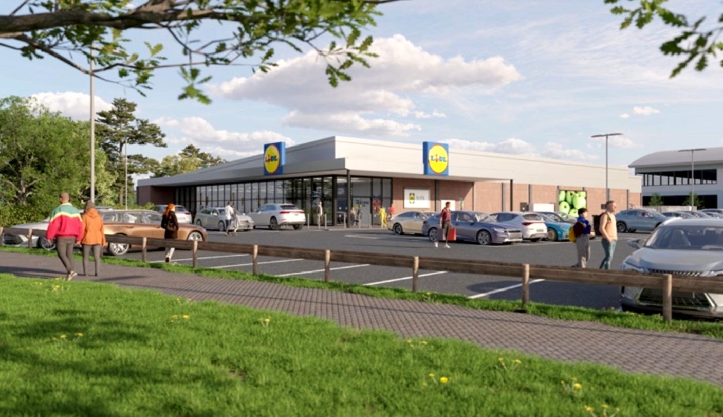 The scheme, by the British arm of the German discount supermarket Lidl, includes a 1,975 sqm store and will have 118 car parking spaces including 12 parent and child spaces and seven accessible parking bays along with six electric vehicle bays and cycle parking.