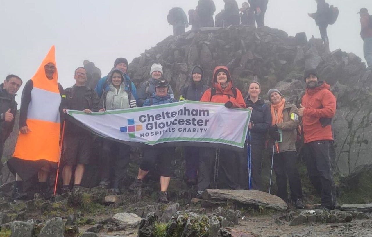 Earlier this month (June) the Big Space Cancer Appeal was revealing how it had hit the £9 million mark in its quest to fund a new centre for patients at Cheltenham General Hospital. At the weekend an intrepid team from Gloucestershire Hospitals’ managed services department climbed the Welsh mountain of Snowdon to raise more funds. While the rest of the country enjoyed a heatwave, the team endured the opposite! But the mission was a success, raising £4,000. You can add to that amount here.
